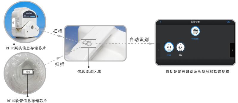 新推出的三款智能蠕動泵具有“泵頭和軟管型號自動識別”功能。通過RFID技術(shù),泵可自動讀取泵頭型號和軟管規(guī)格信息,并在運行方案中設(shè)置相應參數(shù)。不僅幫助客戶簡化操作過程,提高工作效率,而且能夠有效保證泵頭與軟管參數(shù)的正確性,為實現(xiàn)高精度的流體傳輸提供有力支持。