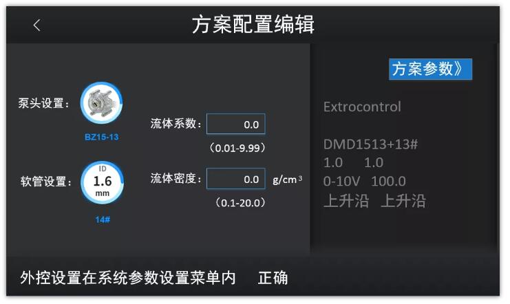 在方案配置界面中可以選擇泵頭、軟管以及確定流體系數(shù)和流體密度。