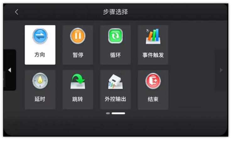 而邏輯步驟一共有八個(gè),包括:方向、暫停、循環(huán)、事件觸發(fā)、延時(shí)、跳轉(zhuǎn)、外控輸出和結(jié)束。