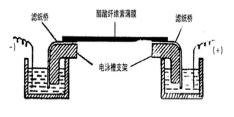 以醋酸纖維制成的薄膜作為支撐體的電泳稱(chēng)為薄膜電泳。 醋酸纖維是纖維素的醋酸酯,由纖維素的羥基經(jīng)乙?;?。 將之溶于丙酮等有機(jī)溶劑中,即可涂布成均一細(xì)密的微孔薄膜, 厚度約以0.1-0.15mm為宜。 醋酸纖維素薄膜與濾紙相比較,有以下優(yōu)點(diǎn):