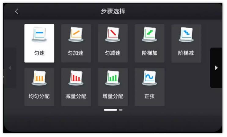 運(yùn)行步驟一共有九個(gè),包括:勻速、勻加速、勻減速、階梯加、階梯減、均勻分配、減量分配、增量分配和正弦曲線傳輸。