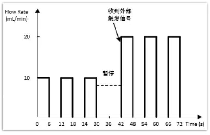 方案內(nèi)容:以10mL/min的流量灌裝6秒(灌裝量為1mL),灌裝3次(間隔6秒),暫停;待收到外部觸發(fā)信號(hào)后,以20mL/min的流量灌裝6秒(灌裝量為2mL),灌裝3次(間隔6秒),停止。