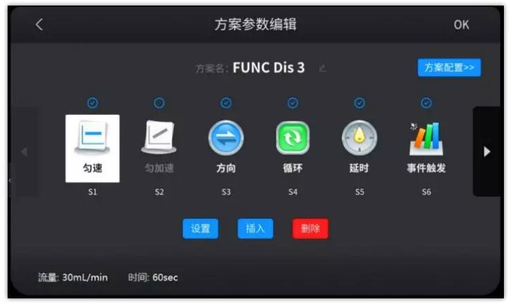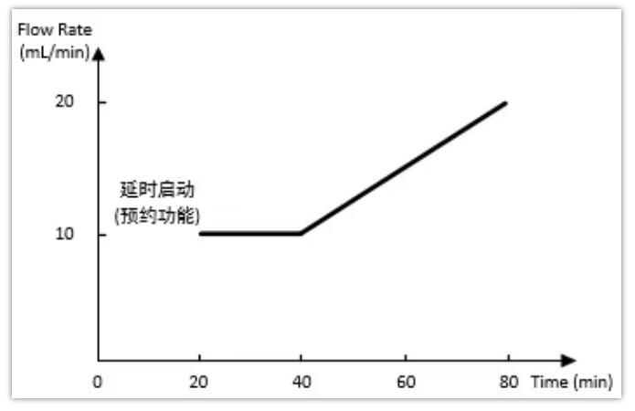 方案內(nèi)容:延時(shí)20分鐘啟動(dòng)泵,以10mL/min流量運(yùn)行20分鐘,之后流量線性遞增,在40分鐘內(nèi)流量從10mL/min遞增至20mL/min。